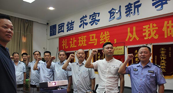 活動(dòng)前期,公交巴士公司層層召開動(dòng)員會(huì),充分利用媒體、公司內(nèi)部QQ、微信工作群、以及橫幅、倡議書等載體,廣泛宣傳開展"文明禮讓斑馬線"活動(dòng)的目的、意義、措施及有關(guān)法律法規(guī)。公交發(fā)展公司邀請?zhí)煸獏^(qū)交警大隊(duì)法宣中隊(duì)中隊(duì)長陳賢義前來講課,以"文明交通·公交車禮讓斑馬線"為主題,對廣大駕駛員進(jìn)行教育宣講,提高駕駛員文明行車、安全行車的思想認(rèn)識;以觀看警示教育片的形式,宣傳路口讓行規(guī)定、通過路口時(shí)行車注意事項(xiàng)以及法律常識等,向駕駛員宣講超速、搶行等交通違法行為造成的危害后果。全體駕駛員舉起右手,莊嚴(yán)宣誓,承諾在駕駛過程中,帶頭做好文明禮讓。