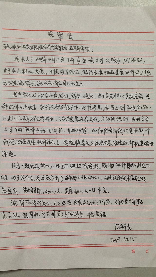 通過這封沉甸甸的感謝信,我們得知,4月15日下午13:20左右,駕駛T61路湘B07902#車的孫師傅返回中心醫(yī)院站點,在清掃車廂時在車廂后座與車身的縫隙間拾到了一個黑色錢包,便上交中心醫(yī)院站調室登記備案,經檢查,錢包內有1500多元現(xiàn)金、身份證、社保卡及多張銀行卡。孫師傅及工作人員馬上通過工作微信群等方式通知線路駕駛員留意報失人員,配合尋找,以便盡快歸還失物。經過一番聯(lián)系、尋找,錢包回到了失主陳先生手中。